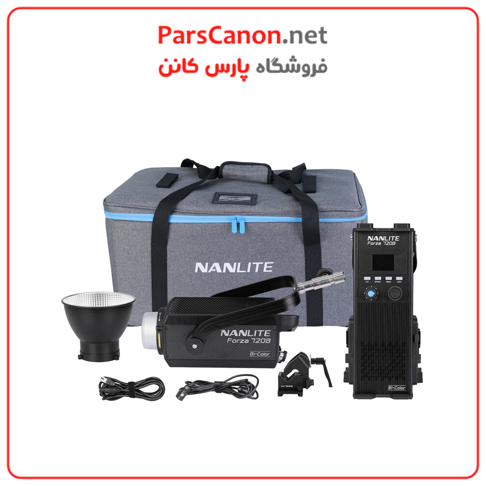 مونولایت نانلایت Nanlite Forza 720B Bi-Color LED Monolight برای پرکردن نقشهای تولیدی که معمولاً توسط چراغهای قدرتمند HMI در بستهای بسیار سبکتر، جمعوجورتر و گرما کارآمدتر انجام میشود، ساخته شده است، همراه با مزیت افزوده کنترل دو رنگ قابل تنظیم. قطعه COB LED می تواند مقدار بسیار زیادی نور دقیق، با CRI و TLCI بالا را با توان نامی 800 وات ارائه دهد، در حالی که به اندازه کافی زیرک است تا از 0 تا 100 درصد با افزایش 0.1 درصد کاهش یابد. مجموعه ای از گزینه های کنترل بی سیم را برای عملکرد تک لامپ یا تنظیمات پیچیده تر چند نوری ارائه می دهد. دوازده افکت عملی داخلی میتوانند سناریوهای نورپردازی پیچیدهای را در چند ثانیه ایجاد کنند، که میتوان آنها را بهعنوان پیشتنظیمات قابل یادآوری سریع با برنامه تلفن همراه رایگان NANLINK سفارشیسازی و ذخیره کرد.